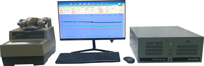 將待測(cè)材料放在轉(zhuǎn)盤上,兩個(gè)磨輪施加一定載荷,使其由轉(zhuǎn)盤帶動(dòng)以一定速度做旋轉(zhuǎn)磨耗運(yùn)動(dòng)。試驗(yàn)承受磨耗時(shí),樣件表面材料受全角度顆粒或絲織狀物磨損形成一完整的圓環(huán)。磨輪隨樣件盤轉(zhuǎn)動(dòng)面轉(zhuǎn)動(dòng),產(chǎn)生相對(duì)運(yùn)動(dòng)和磨耗,而轉(zhuǎn)動(dòng)過程中磨輪軸相對(duì)于轉(zhuǎn)盤轉(zhuǎn)軸的偏移產(chǎn)生滑移運(yùn)動(dòng),通過傳感器獲取摩擦?xí)r的扭矩信號(hào),經(jīng)放大處理,輸入計(jì)算機(jī)經(jīng)A/D轉(zhuǎn)換將扭矩信號(hào)通過運(yùn)算得到摩擦系數(shù)曲線。從而磨耗材料。
